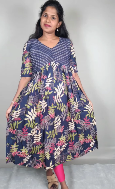 Step out in style with this elegant and comfortable Alia cut maxi dress. Made from high-quality cotton fabric, this dress drapes beautifully, offering a relaxed and flattering A-line fit. The design highlights a trendy V-neck yoke with a crisp stripe pattern that provides a chic contrast to the bold, colorful leaf print on the lower portion of the dress. Lining is provided only for the chest portion, ensuring comfort without adding unnecessary weight. This maxi dress is perfect for a variety of occasions, from a day out with friends to a relaxed evening gathering.