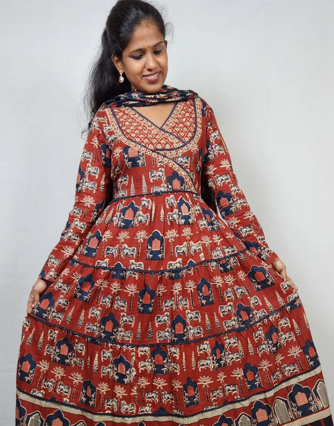 Step out in style with this elegant three-piece Anarkali suit set. The rich brick red color and intricate Ajrakh print on soft cotton fabric create a sophisticated look. The long, flared Anarkali kurta features a beautiful over-the-wrap style with a hand-embroidered neckline, adding a touch of intricate detail. The set includes a matching pant and a coordinating dupatta, both with complementary prints. This suit set is an excellent choice for festive occasions, gatherings, or any event where you want to make a statement with classic Indian craftsmanship.