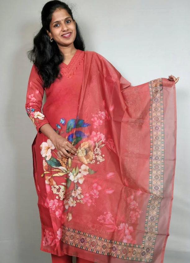 Step out in elegance with this stunning three-piece suit set. The entire set is crafted from lightweight and luxurious Organza fabric, known for its subtle sheen and graceful drape. The kurti and pant are a rich coral shade, with the kurti featuring a delicate V-neckline with intricate lace or thread detailing. The true highlight is the digitally printed Organza dupatta, adorned with a vibrant and beautifully detailed floral design that adds a modern, artistic touch. The dupatta is framed by a sophisticated border, tying the look together perfectly. This set is ideal for festive occasions, weddings, or any event where you want to make a statement.