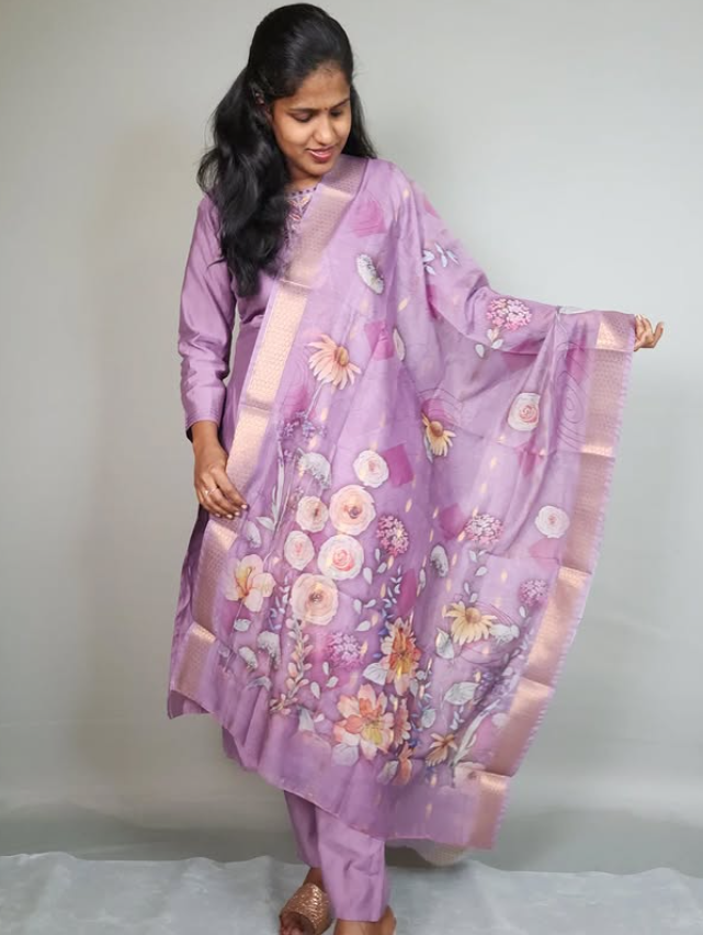This elegant three-piece suit set in a soft lilac shade is a perfect blend of modern style and classic charm. The kurti and pant are crafted from luxurious Vatican Silk, a fabric known for its graceful drape and subtle sheen. The kurta features delicate embroidery around the neckline, adding a touch of sophistication. The set is elevated by a stunning Silk Organza dupatta with a beautiful golden woven border. This dupatta showcases a mesmerizing digital print of large, blooming florals, making the entire ensemble a work of art. This suit set is perfect for festive occasions, weddings, or any event where you want to look effortlessly stylish and unique.