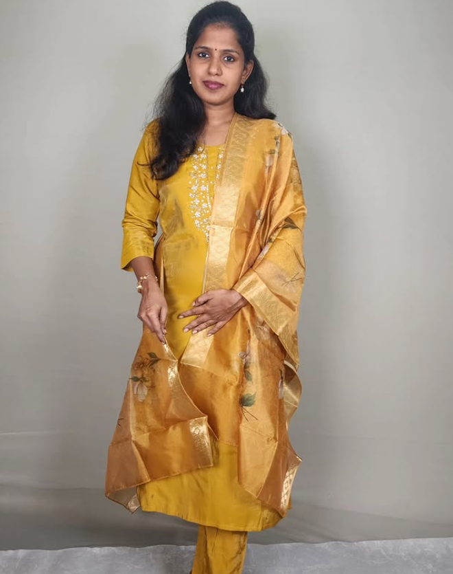 Model: Kurta, Pant, and Dupatta Fabric: Roman Silk with a floral Organza dupatta Lining: Yes