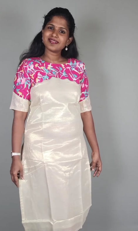 This elegant premium tissue kurti is designed for the modern mother seeking both style and functionality. The shimmery, lustrous body of the kurti provides a sophisticated and festive look. The standout feature is the vibrant pink yoke with a delicate floral pattern, beautifully highlighted by scallop neck detailing that adds a touch of intricate design. The elbow sleeves are a perfect blend of modesty and comfort. While designed with a concealed, this kurti is stylish enough for any special occasion.