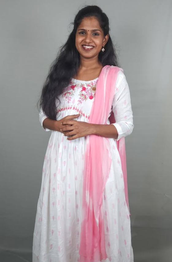 This elegant three-piece suit set is a perfect blend of delicate charm and classic style. The set includes an Alia cut mul cotton kurta, a matching pant, and a baby pink dupatta. The kurta features a beautiful white base with a subtle print and a stunning hand-embroidered neckline in pink and green floral motifs. The soft and breathable mul cotton fabric ensures all-day comfort, while the flared silhouette offers a flattering and feminine look. This set is a graceful choice for daytime events, casual outings, or any occasion where you want to look effortlessly stylish.