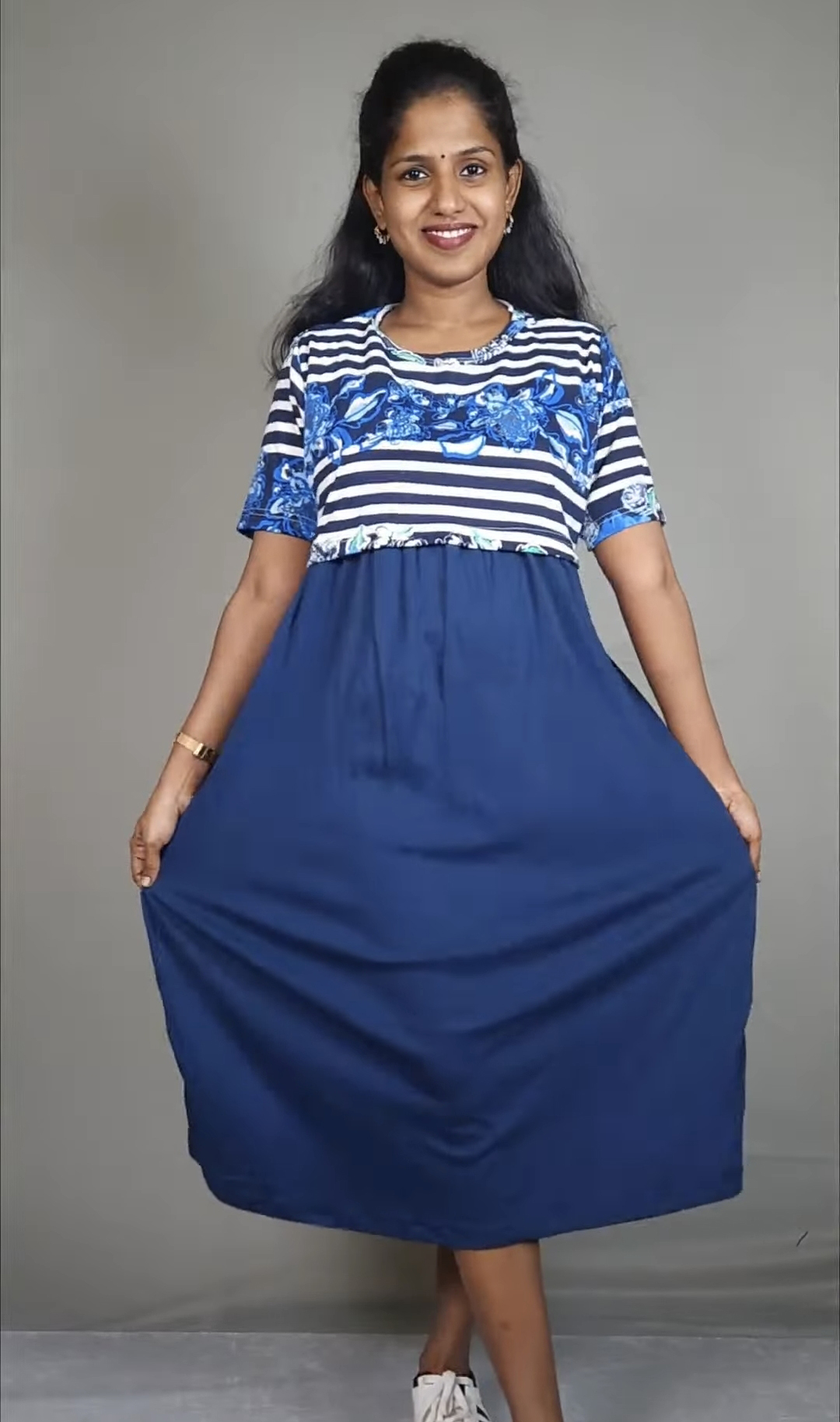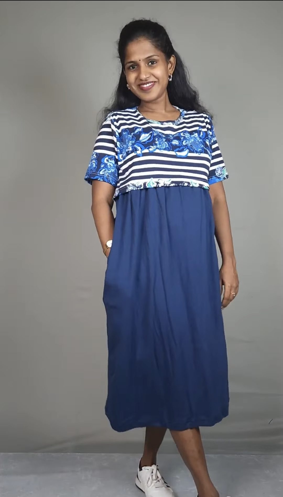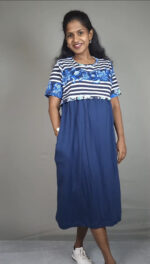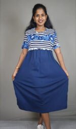 Dive into effortless style with the Floralstip Blue Stripe & Floral Print Midi Dress. This charming dress features a unique design with a chic blue and white striped bodice, beautifully accented by a vibrant blue floral print detailing at the waist. The flowing solid navy blue skirt completes the look, creating a graceful and flattering silhouette.