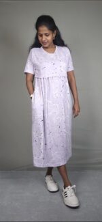 Embrace elegant comfort with the Lavanyam Abstract Print maternity Wear. This beautiful dress features a soothing lilac hue adorned with a stylish white and black abstract swirl pattern, offering a sophisticated yet playful aesthetic. Its flattering midi length and short sleeves make it a versatile addition to your wardrobe, perfect for both casual outings and relaxed gatherings.